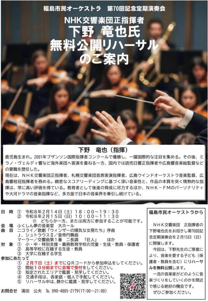2⽉15⽇(⽇)にふくしん夢の⾳楽堂で開催予定の「福島市⺠オーケストラ第70回記念定期演奏会」について、指揮者の下野⻯也先⽣のご厚意により、⾳楽を愛する⼦どもたち(保護者・教員を含む)に向けてリハーサルを無料公開することになりました。⼀流の⾳楽家がどのように⾳楽づくりをしていくのか、ぜひ間近で感じていただけましたら幸いです。